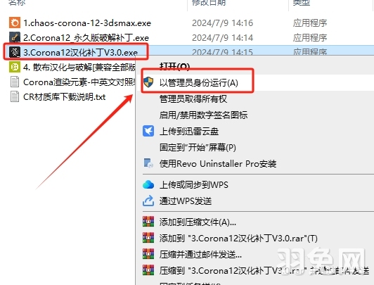 14、运行汉化补丁,选择【3.Corona12-update-2_汉化补丁V1.0.exe】鼠标右键以管理员身份运行