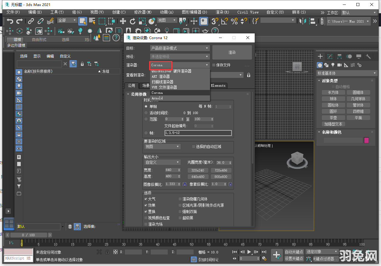 18、打开3dmax软件,按照快捷键F10,弹出渲染设置窗口,找到Corona选择