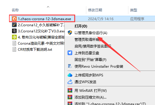 2、所有压缩包解压之后,选择【1.chaos-corona-12-update-2-3dsmax.exe】,右键【以管理员身份运行】开始安装程序。