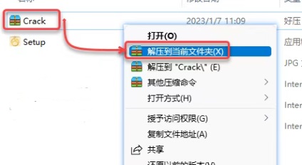 8、关闭杀毒软件之后,鼠标右击【Crack】选择【解压到当前文件夹】