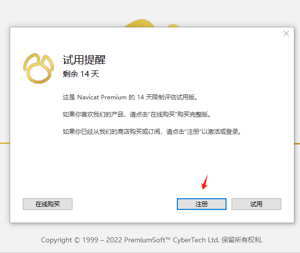 14、双击桌面【Navicat Premium 16】图标启动软件。在弹出的试用提醒时点击【注册】